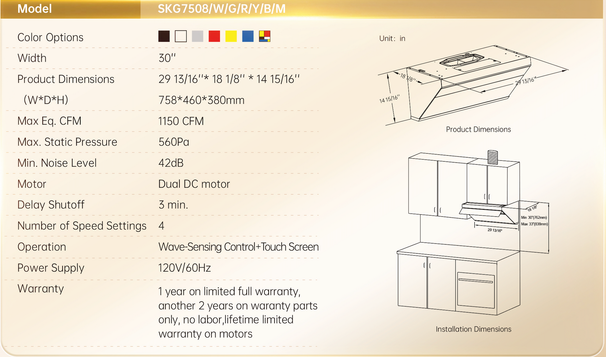 The SKG7508W combines modern design with advanced performance, delivering a range hood that enhances both style and function in your kitchen. Its ultra-thin body is approximately 4 inches slimmer than conventional hoods, creating a sleek, space-saving profile without sacrificing power. With a maximum airflow of 1150CFM, it ensures strong and efficient extraction to keep your kitchen air fresh and clean.